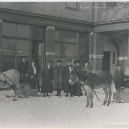 Sepia print. Snapshot. Mounted on tan matboard. Image of a group of people, bundled up & standing on a snow-covered street in front of a stone & brick building. Two donkeys & sleds also standing on snowy road. Signs in windows: "Drug Co." "Cigars & Tobacco". Partial sign above columnal entrance: "The FE[RRIS]"