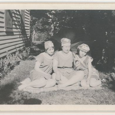 Update - 2009: Black & white print. Snapshot. Image of three women in early bathing suits sitting on a blanket in a grassy yard. Clapboard house at left. Trees & foliage at right & behind. Women at left & center in identical suits & caps; woman at right in striped suit & patterned cap. Woman at center is holding an open umbrella.
