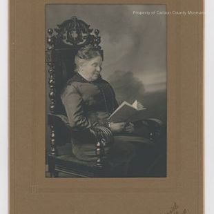 Photograph shows an old woman seated in a chair, reading a book. The shair is large, wooden, and ornately carved, with a wreath carved in the top, and arm rests. It appears to be dark wood, and shiny.