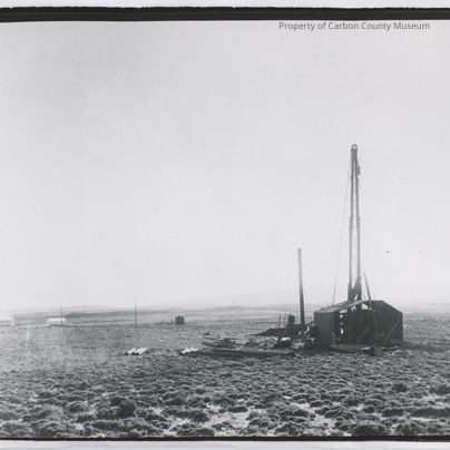 Black & white glossy contact print. Image shows a drilling rig (at right) at a desolate prairie area. Small storage tank & two wall tents area at left. Other pipe & logs are stacked at center area. Ground is covered in sagebrush.