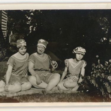 Update - 2009: Black & white print. Snapshot. Image of three women in early bathing suits sitting on a blanket on a grassy lawn. Clapboard house at left; foliage & trees at right & behind. Women at left & center wearing identical suits & caps; woman at right in striped suit & patterned cap. woman at center is holding an open umbrella & is making a face at the camera.