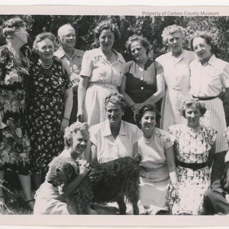 Update - 2009: Black & white print. Snapshot. Image of 11 women, 1 man & a dog posed in front of thicket of trees. Six of the women & the man are standing; the other five women are kneeling or sitting on the ground. Woman in front row at left is holding what appears to be an airdale dog. All of the women are in dresses except the woman in front row right - she is dressed in a pant suit. Man is in shirt sleeves.