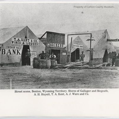 Printed under image on lower edge: Street scene Benton, Wyoming Territory. Stores of Gallager and Megath[sic], A.H. Huyell, T.A. Kent, A.J. Ware and Co.