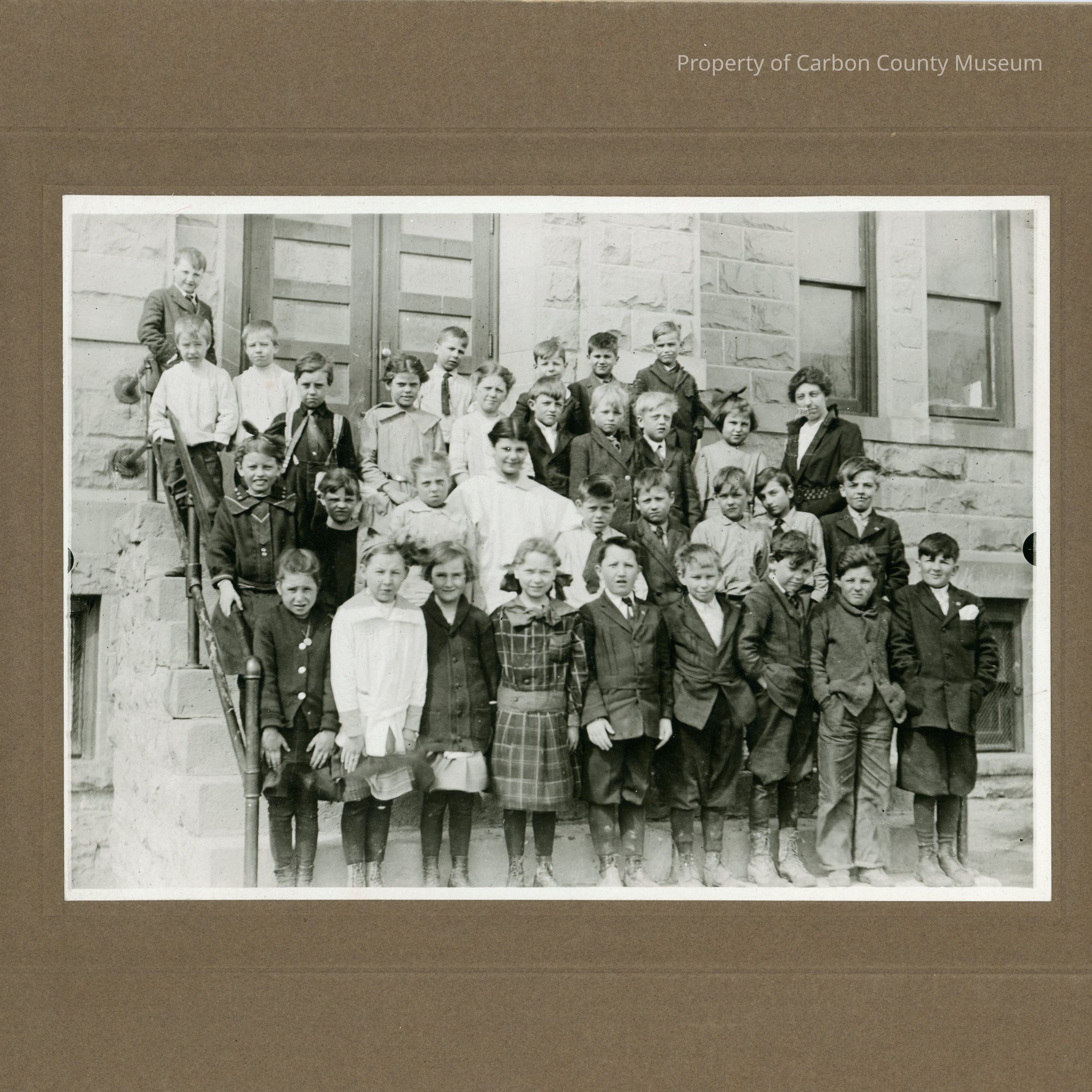 Update - January 2010: Black & white print attached to taupe colored matboard. Image shows a class picture of young boys & girls in 5 informal horizontal rows on the high steps of a sandstone school building. Wooden doors at top of stairs are closed. A woman is seen at center side right.