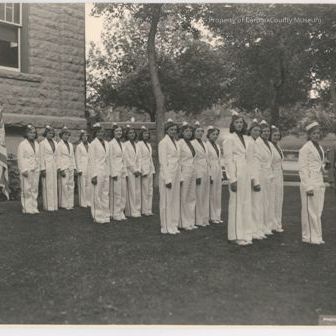 All the women are in waist-length white jackets over dark shirts, white pants with a dark stripe down the side, white shoes, and a military-style side cap that is white with dark sides. The man wears a light suit and vest, dark tie, and light hat.