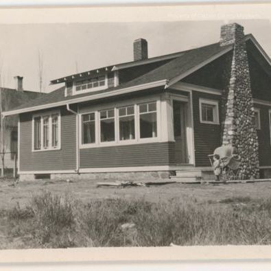 Update - 2009: Black & white print. Snapshot. Image of a dark clapboard house with trapezoidal stone chimney & flat dormer. Light trim around windows. Second chimney (brick) at back of roof. Second house in background. Wood boardwalk at right side of house; dirt & grass in foreground. small child &baby buggy on boardwalk in front of door.