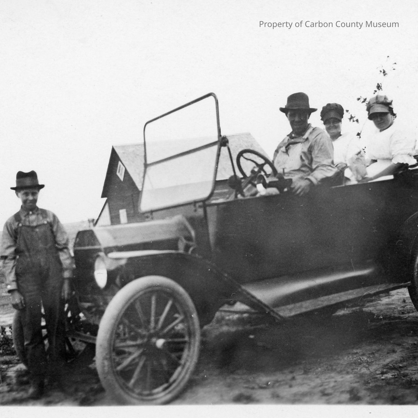 Update - 2009: Black & white print. snapshot. Image of two men & two women posed with a vintage automobile. Women are seated in back seat & are dressed in white with medium-colored bonnets/caps on their heads. The top & windshield are down on the automobile. Men are wearing overalls; one man is behind the wheel; the other is standing in front of the automobile. Structure & prairie in background.