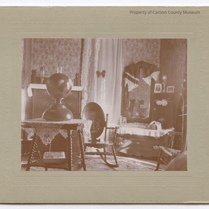 Sepia print. Snapshot. Mounted on light green matboard with patterned edge. Image of the interior of a home. Patterned wallpaper & sheer lacy window curtains in background. Dresser with tall mirror draped with dark cloth with white lace edging. Rocking chair at center with oval back. Table & ornate glass lamp at left; tall chest of drawers behind. Second chair & bedpost just visible at left. Patterned rug on floor. Butterfly on curtain.