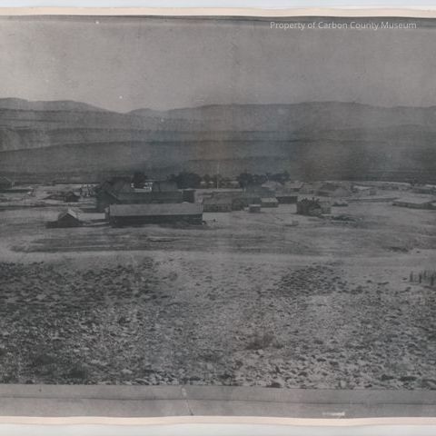 Update 2009: Black and white copy print. Image of a group of buildings on a wide flat prairie with hills behind, sage brush and corral in foreground. At lower and upper margins the original mat can be seen including name of photographer; "Howard Photo".