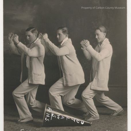 Update March 2011: Black & white print on paper board. Image of three boys in a partial kneel position, with arms bent at the elbow & held up. They are wearing white slacks, long button up sweaters with shawl collars. A megaphone is laying on its side in front of them on which is written in white: "Outlaws R. H. S." Under each boy in white: "Eddie" "Pep" "Bill"