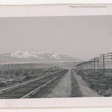 Update February 2011: Black & white print on post card paper. In foreground are railroad tracks between high line poles continuing into the distance. Fences are on both sides of the track. Elk Mountain is in the distance & has snow covering the slopes. Railroad tracks ran between Walcott & Saratoga, was called Slow & Easy Train.