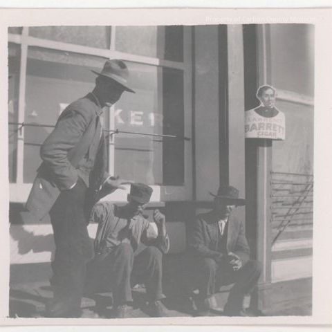 Update March 2011: Black & white print on post card paper. On photo left is a man standing holding his left hand on the hat of a seated man. The seated man has his right hand on the standing man's wrist. Another man is seated on photo right. All three men wear hats & the one in the center has a pipe in his mouth. A sign on the building behind them has the head & shoulders of a man's image & reads: "Lawrence Barret Cigar" In glass window behind them visible letters: "KER"