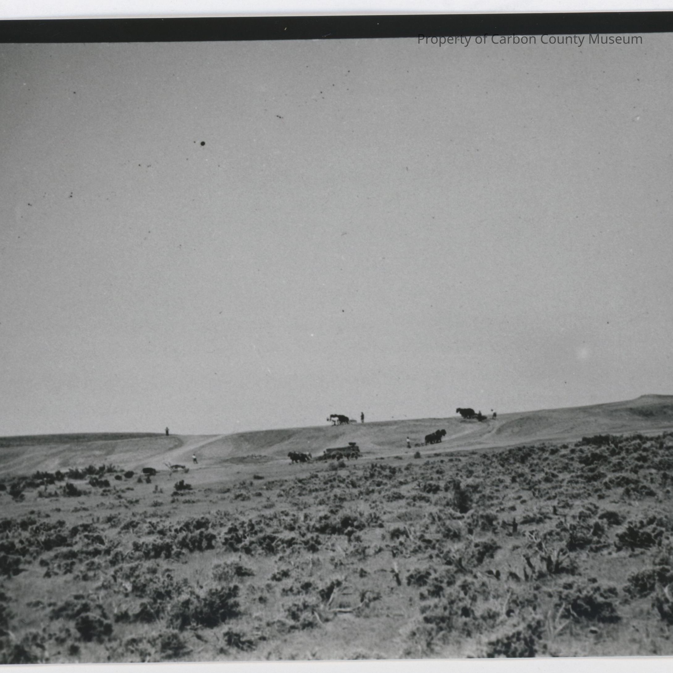 Four black & white copy prints. Snapshot. Image of men, wagons, dirt graders & horse teams working on a dirt hill/berm. Sagebrush prairie in foreground.