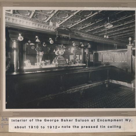 Typed on a white paper that is glued to the bottom of mat: "Interior of the George Baker Saloon at Encampment WY about 1910 or 1912 - note the pressed tin ceiling"