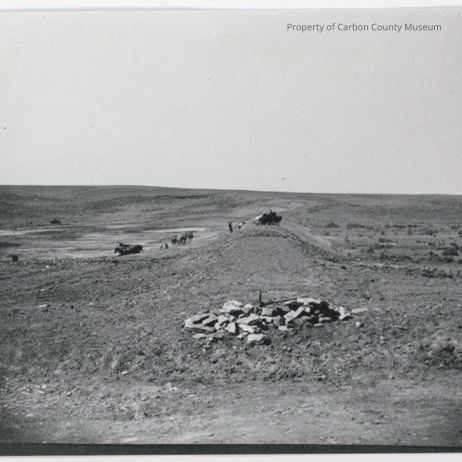 Two black & white copy prints. Snapshot. Image of a hill of dirt with men & teams working on it. rolling prairie in background. Pile of rocks & a pick in foreground.