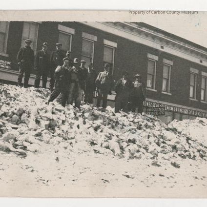 Update March 2011: Black & white print card. Image of eleven men standing on a slope of snow covered rocks. Behind them is a multi level brick building with lower level partially obscured by the rocky slope. Signs on the building are: "U.S. Dept of Agriculture Forest Service Office of Hayden National Forest" "Couzens Store Co" "...ods Groceries and Hardware. Building has rectangular windows with light colored places above & below windows. fascia has white beneath decorative crown molding.