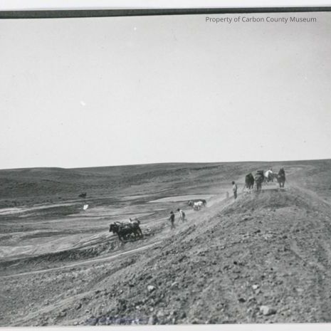 Two black & white copy prints. Snapshot. Image closer up of a hill of dirt being worked by men, horse teams & dirt scrapers. Rolling hills in background.