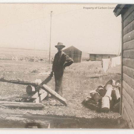 Update March 2011: Black & white snapshot print of a man with a long hand saw in his right hand. He has cut off a piece of a long log. The remainder of log is sitting on wood blocks. A pile of shorter cut pieces is on his left beside a wood building. His left hand is on his hip. In the background is a clothes line with things hanging, two more buildings & wagons. Written on the back in pencil: "Ike sawing wood, Encampment"