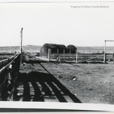 Black & white copy print. Snapshot. Image of corrals & large piles of hay in midground. Prairie & low hills in background.