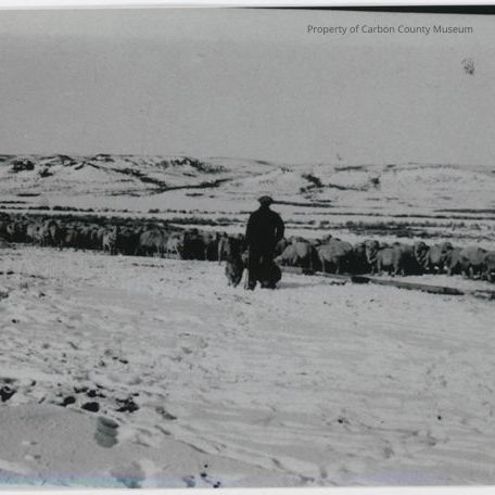 Black & white copy print. Snapshot. Image of a man, two dogs & a large flock of sheep on a snowy prairie. Snow covered hills in background.