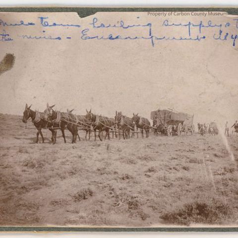 Written in blue ink on the top of the top of the picture: "Mule team hauling supplies to the mines Encampment, Wyo"