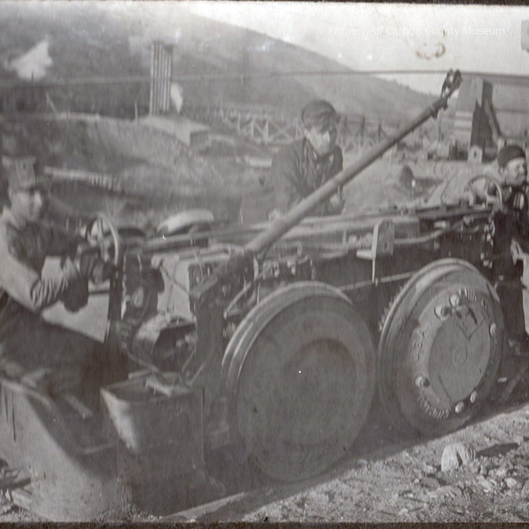 Photo shows three men and a piece of machinery near a mine. The piece of machinery has two wheels located right next to each other on the visible side (and presumably 2 on the far side) that fit in train tracks and have "Chicago U.S.A." molded on them. An arm rises from the thing to a wheel that rides below a wire that crosses the top of the picture and is suspended by a brace poking into the top right corner. The closer end of the machine, int he bottom right of the picture, has a look that could be used to pull it. A round rod runs nearly the length of the machine, with a small steering wheel-looking wheel on each end. A metal seat is built into each end. On the left side, a man in long sleeves, overalls, and a strangely angular hat is seated. On the far side a man in a dark shirt, suspenders, and a cap is seated. Leaning, from the far side, on the machine is a man in a dark shirt and cap.