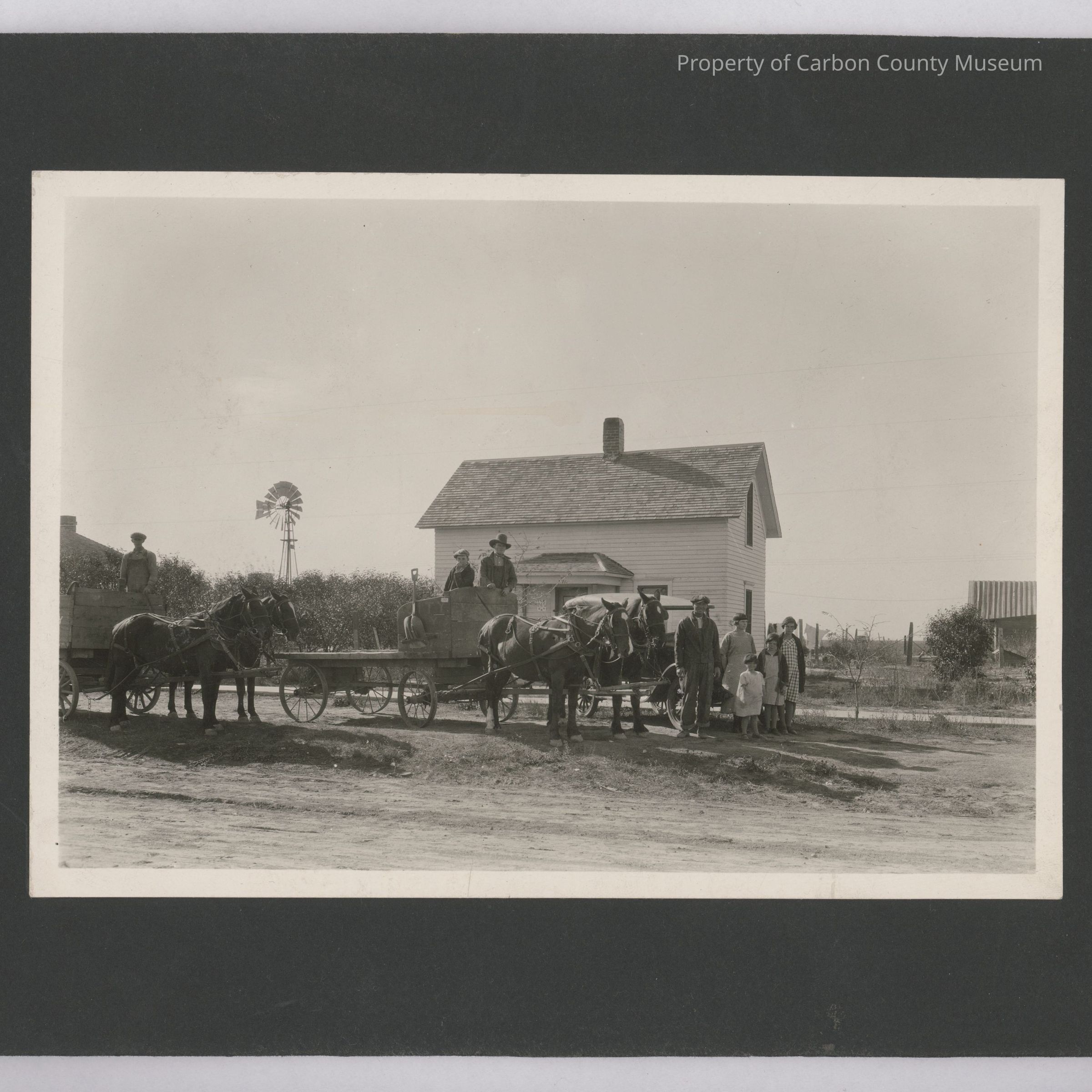7 1/8" x 5" black and white photograph on 9" x 7" black mat. Photograph shows two horse drawn carts in front of a white house.