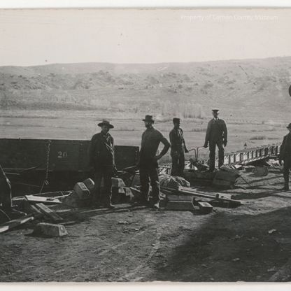 Update March 2011: Black & white print card. Image of six men standing on a dirt bank near a wagon sitting on a lower level. There are boards & concrete markers with numbers on them on the ground. A large wood boxy looking container with "20" painted on the side is behind them. In the distance is a wood tram on wood supports. There is a pulley wheel on a wood frame on photo right. A pallet near the pulley has more concrete markers on top. A row of barren trees & a hill are in the distance.