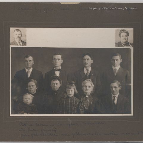 Update 1/2008: Black and white print mounted on dark grey matboard. Image of a family group-five men, three women, and two children. Secondary images of a man (left) a woman (right) in upper corners.