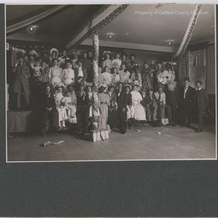 Black & white print. Mounted on dark grey matboard. Group of people in costume posed on & in front of a stage. Stripes & stars on banners wrapped around pole at center & strung across ceiling. Suitcase with sign on floor in front of wrapped post at center.