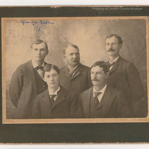 Update 1/2008: Sepia print. Mounted on dark brown matboard. Studio portrait. Image of five men, head and shoulders view in two rows-three in back and two in front. Painted backdrop in background. Men are all dressed in dark suits, white shirts and ties (one is a bow tie). The men in the front row appear to be seated; the back row appears to be standing.