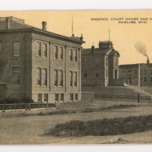 Unused picture postcard of Rawlins. 5 1/2" x 3 5/8" black and white picture of the Masonic, Court House and H.S. Building, Text says "Masonic, Court House, and H.S. Bldgs., Rawlins, Wyo." Furthest building has a smoking chimey.Collection