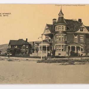 Unused picture postcard of Rawlins. 5 1/2" x 3 5/8" black and white picture of the Ferris Mansion. Text on front says "Residence Street, Rawlins, Wyo." Road appears wide and unpaved, with plans growing at the edge of it.Collection