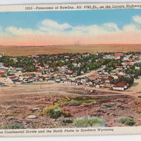 Text on top says "1053 - Panorama of Rawlins, Alt. 6787 Ft., on the Lincoln Highway (U.S. 30)", bottom text says "Between the Continental Divide and the North Platte in Southern Wyoming".Collection