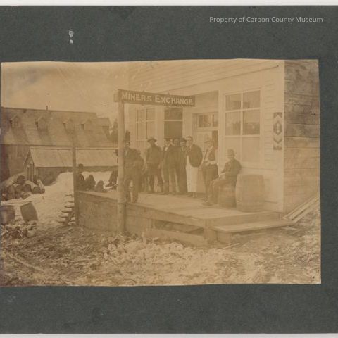 Updated 1/2008: Sepia print. Mounted on dark gray matboard. Image of 12 men and a dog posed on a raised boardwalk in front of a clapboard building with a sign "Miner's Exchange". Snow, logs and other buildings can be seen in the background at left. Rocky street can be seen in the foreground. Two large barrels on right side of boardwalk on one of which a man is seated. men are wearing suits or more casual shirt sleeves; all but two are wearing hats. Man, third from right, is wearing a long white apron and no hat.