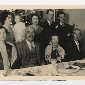 Black and white photograph of O'Melia family. 5 5/8" x 3 7/16". Photo shows 4 adults seated at a table with, presumably, a big Christmas dinner in front of them, and 4 adults standing behind, one holding a baby. In the back corner of the room is a tinsel-covered tree.