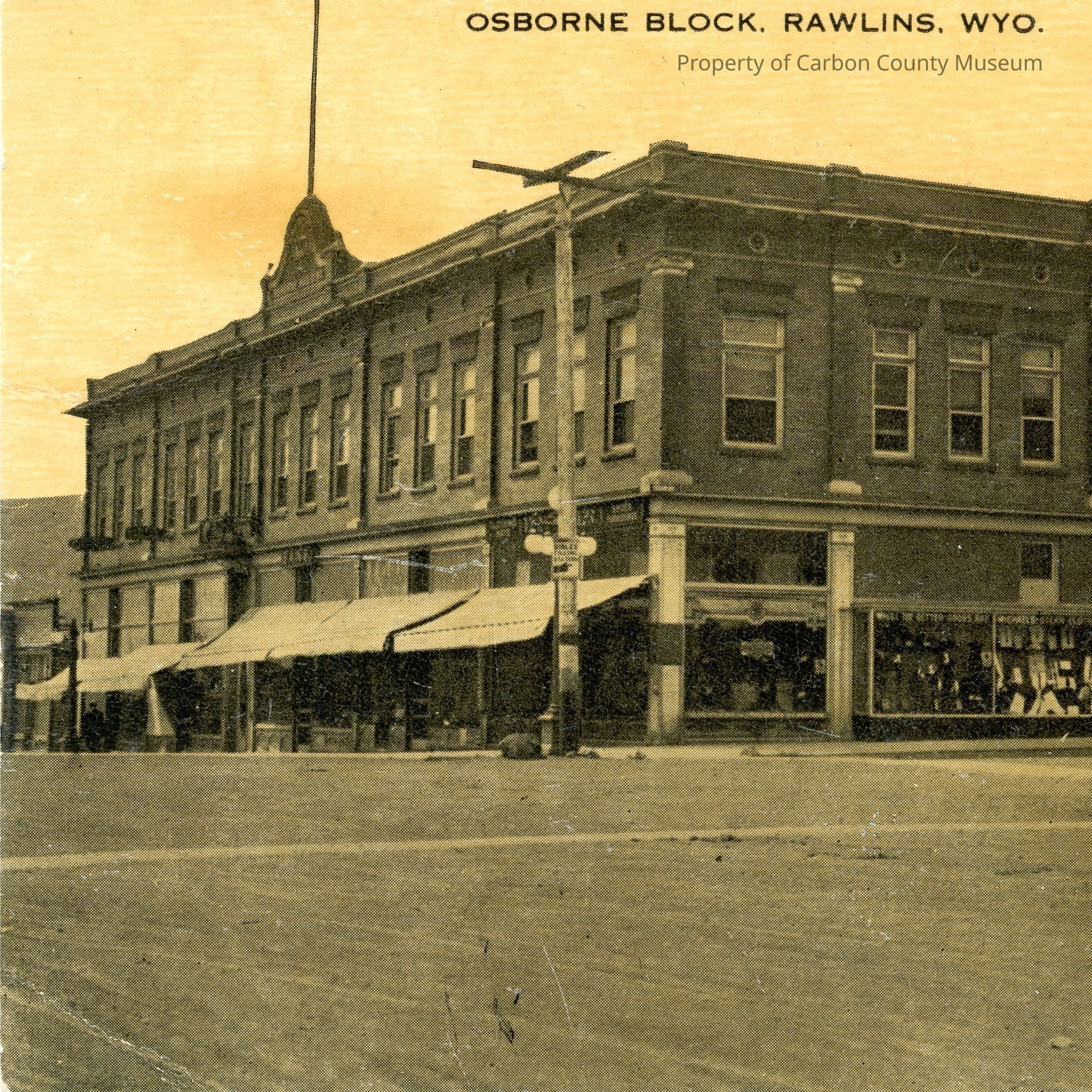 Postcard featuring a sepia tone photograph of the Osborne Building. Black text along the top edge of the postcard reads "OSBORNE BLOCK. RAWLINS, WYO." On the reverse is a designated space for a postage stamp along with the text "POST CARD" and "BLACK AND WHITE" and the serial number 45736Collection
