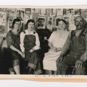 From left to right: Signe Olson in cuffed overalls and a dark shirt, with glasses; Frances Olsen, in cuffed overalls and white shirt and dark boots; Karolina Olsen in a light colored housedress; and Ole Olson in overalls, a vest, and medium dark shirt.