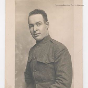 4 1/2" x 6 1/4" black and white photograph of Robert O'Melia in army uniform. A wool jacket is all that is visible of his uniform, with a circular badge at his neck, eagle buttons, and no other visible insignia.Collection