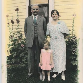 2 copies of a colorized photograph of Katerina and Ole P Olson with granddaughter Frances. 8 5/8" x 10 5/8" picture. They stand in front of a yellow house with hollyhocks growing in front of it. Ole wears a greay suit and teal tie, standing with his hands behind him. Katerina stands to his left (viewer's right) in a blue and white floral dress and 3 strand pearl necklace.