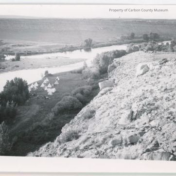 Black & white print of birds eye view of Platte River. Tents are set up beside the river & people are in front of them. A steep bluff is on photo right & more people are on top of the hill. Rocks & brush are on right foreground. On the river are ties along the edge on opposite bank from tents. Trees & bushes are along river's edge. A ridge is in background in the distance of layers of rock & dirt.