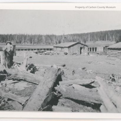 Black & white print of wood, cabin like, buildings. The background is evergreen trees & the foreground logs laying askew. A man's back is toward photographer. He is working on a tall stump.