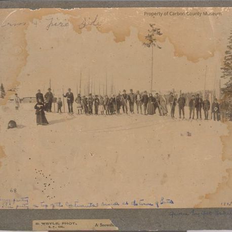 Written on emulsion surface along lower edge: (Black ink) "68" (Blue ink) "Skiing party Snow shoe (sic) party on top of the Continental Divide at the Town of Battle" "1908 or 9".