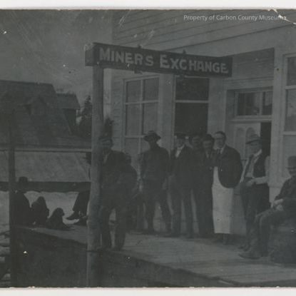 Updated 1/20/08: Black and white print. Image of 12 men and dog posed on a raised boardwalk in front of clapboard building with a sign "Miner's Exchange". Snow, logs and other buildings can be seen in the background at left. two large barrels on right side of boardwalk on one of which a man is seated. Men are wearing suits or more casual shirt sleeves; all but tow are wearing hats. Man, third from right is wearing a long white apron and no hat. Very dark image. Same image as 1956.254.0021, cropped to boardwalk.