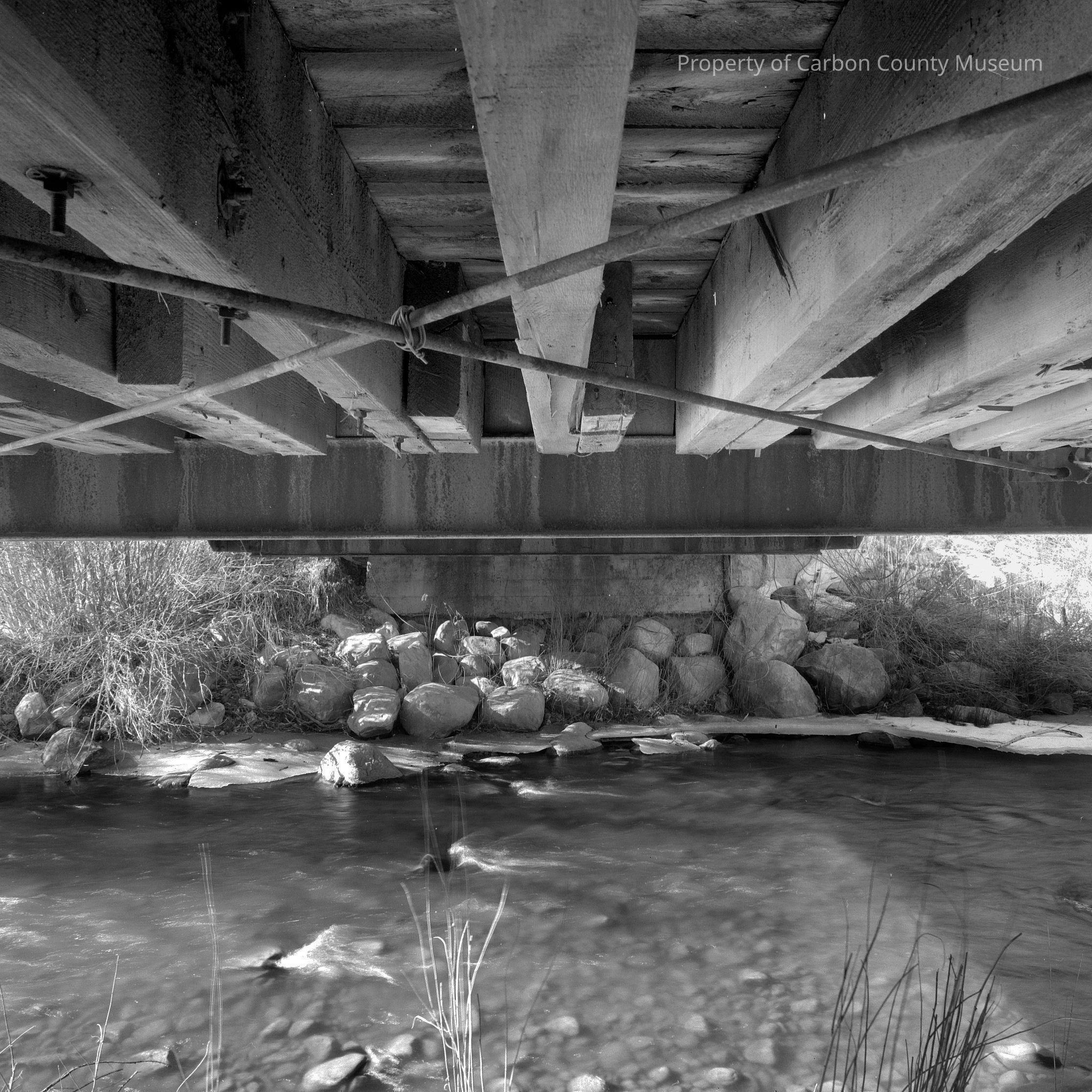 A 5" x 7" black and white print of the Medicine Bow Bridge spanning the Medicine Bow River on County Road 6-3, Elk Mountain, WY. This print designated on photographer's sheet and print front and back as Haer WY-61-13. Underside decking of bridge. View to the west. Shot from north bank of the Medicine Bow River.Collection