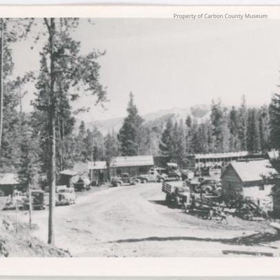 Black & white print of two rows of small wood buildings of either side of a dirt road. Several vintage cars, pickup trucks, & stock truck are parked around the buildings. Tall trees surround the buildings & a mountain in the background.