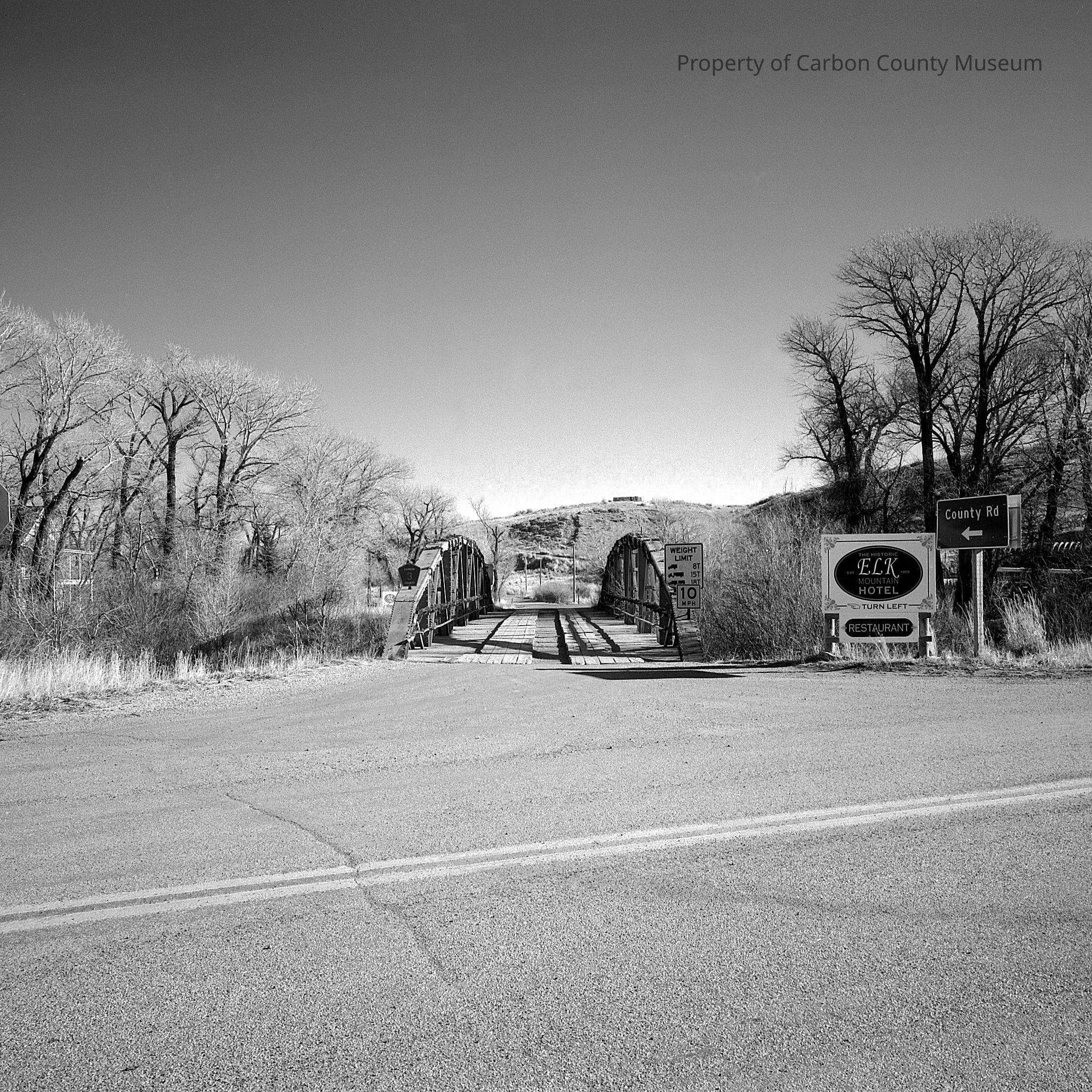 A 5" x 7" black and white print of the Medicine Bow Bridge spanning the Medicine Bow River on County Road 6-3, Elk Mountain, WY. This print designated on photographer's sheet and print front and back as Haer WY-61-14. West approach to bridge.View to east northeast. Shot from south side of Medicine Bow River. Sign to Elk Mountain Hotel and County Rd. on right as entering bridge.Collection
