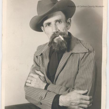 Black & white print of a bearded man smoking a cigarette. He has on a cowboy hat, striped jacket, dark shirt & pants. His arms are crossed in front of him & he has a large ring on the third finger of his left hand.