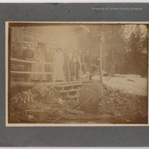 Update 1/2008: Sepia print. Mounted on grey matboard. Image of a group of people-seven men and three women on the porch of a log building. There is a lamppost at far end of porch. Snow barrels and trees can be seen in background. Ground on either side of porch steps churned up into what look like trash heaps. Men dressed in casual fashion and all but two are wearing hats. Women are wearing long dresses-two appear to be "sack dresses"; each is also waring a hat.