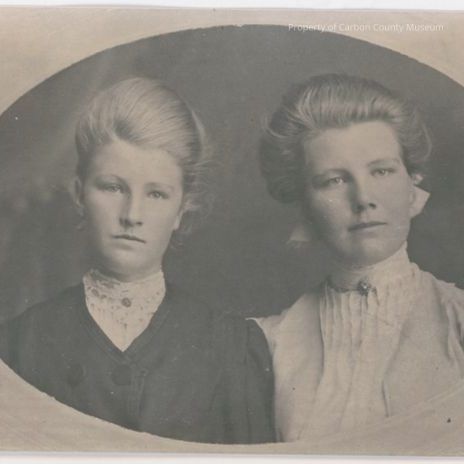 Two black & white copy prints of two young women. Woman on left is wearing a dark "V" neck dress with white blouse underneath & a brooch. She has light colored hair pulled up & back. Woman on the right has on light colored high collar blouse with collarless jacket. Her hair is light & is pulled up & back & tied with a large ribbon.
